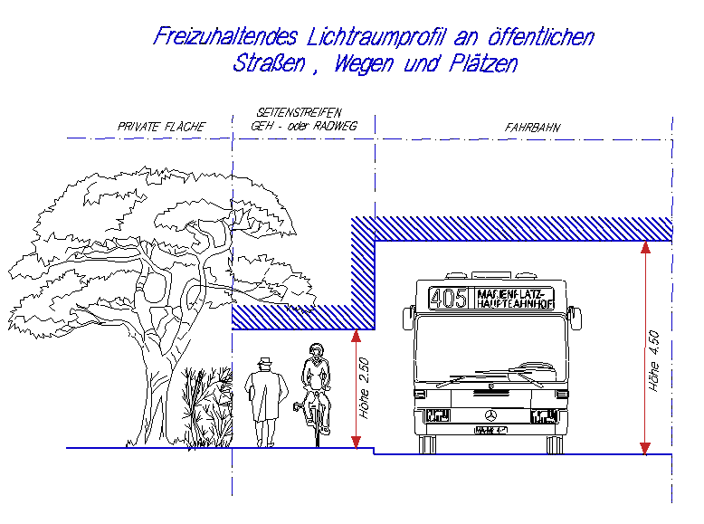 Helfen Sie mit, dass solche Situationen gar nicht erst entstehen und schneiden Sie die Überhänge bitte so rechtzeitig und ausreichend zurück, dass es in der Wachstumsperiode nicht zu Problemen kommt. Die freie Höhe über dem Geh- und Radweg muss 2,50 m, über der Fahrbahn 4,50 m betragen.